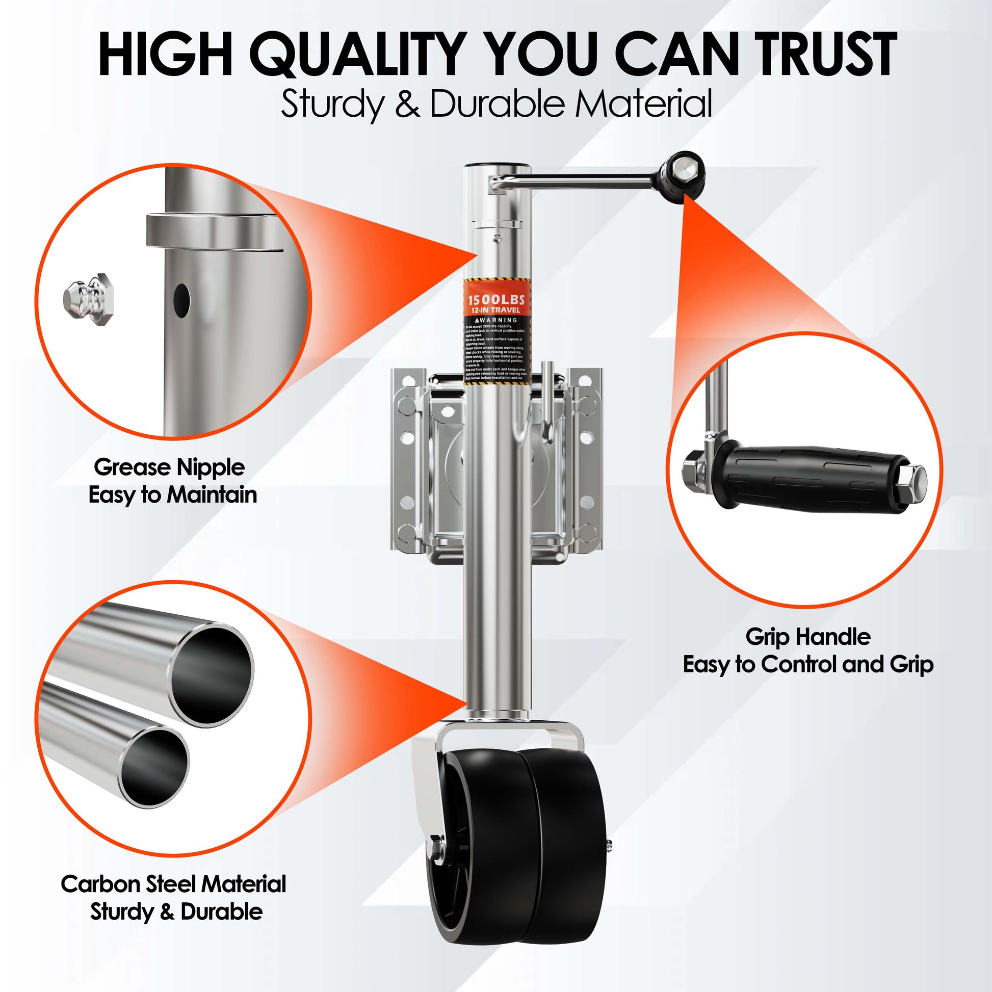 - Robust Lifting Capacity: Elevate your trailering experience with our trailer jack, boasting a robust lifting capacity of 1500 lbs; effortlessly adjust heights from 23.6 to 33.6 inches to accommodate trailer tongues ranging from 3" to 5"