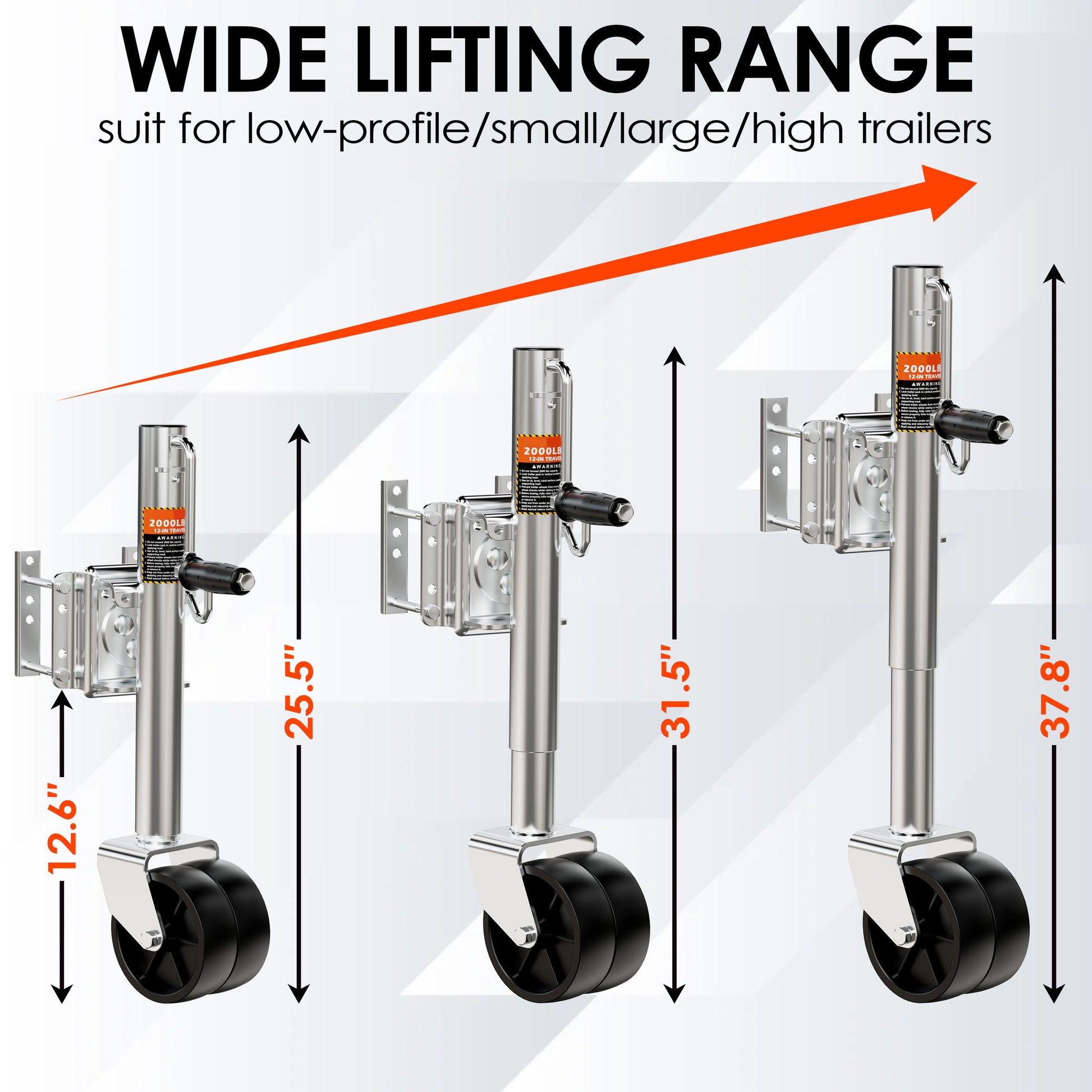 - Robust Lifting Capacity: Elevate your trailering experience with our trailer jack, boasting a robust lifting capacity of 2000 lbs; effortlessly adjust heights from 25.5 to 37.8 inches to accommodate trailer tongues ranging from 3" to 5"