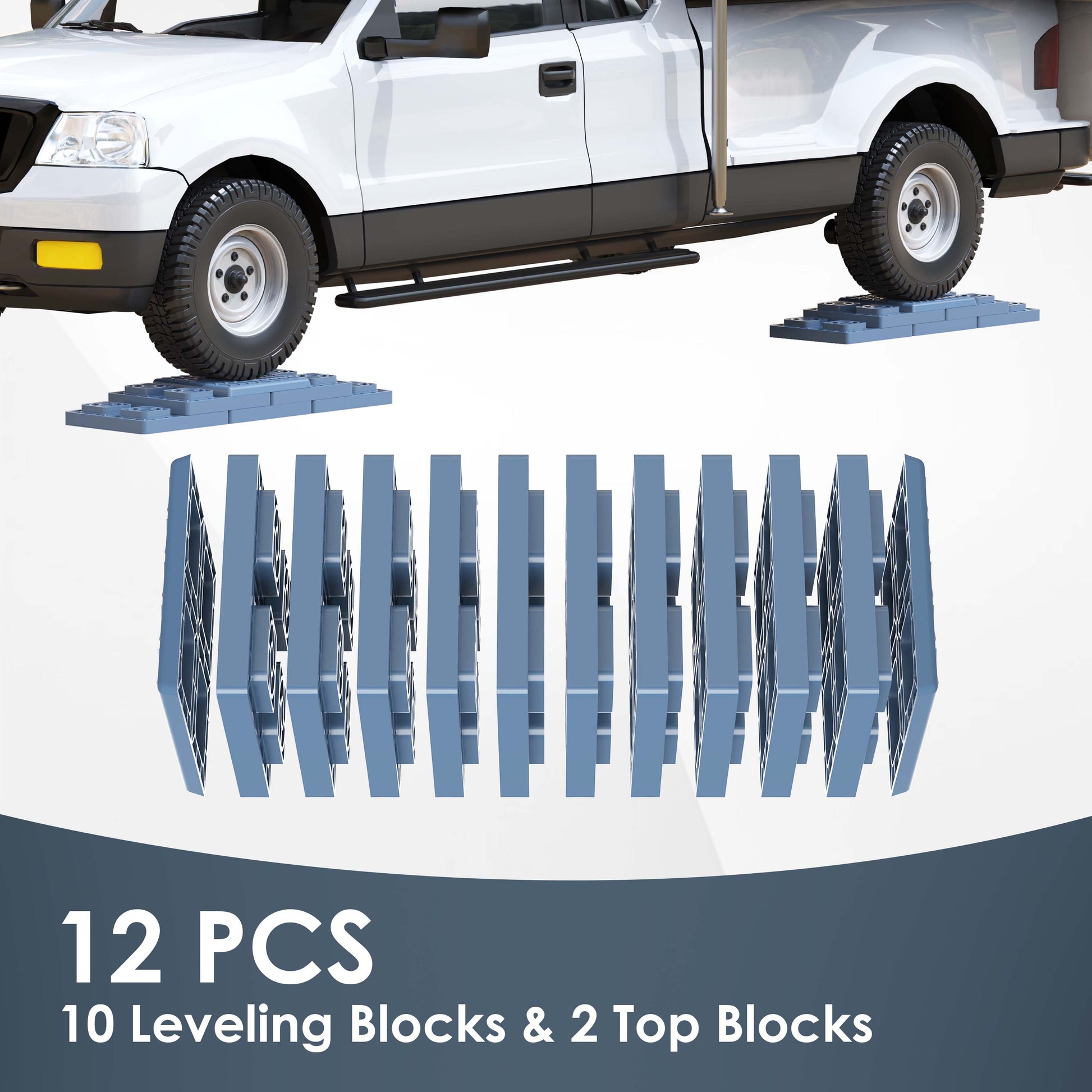 - 12 Pcs Leveling Blocks: Kit includes 10 leveling blocks & 2 top blocks and storage bag. Each Leveling Blocks measure 8.5" x 8.5" x 1.5", top Blocks measure 8.5" x 8.5" x 0.7".