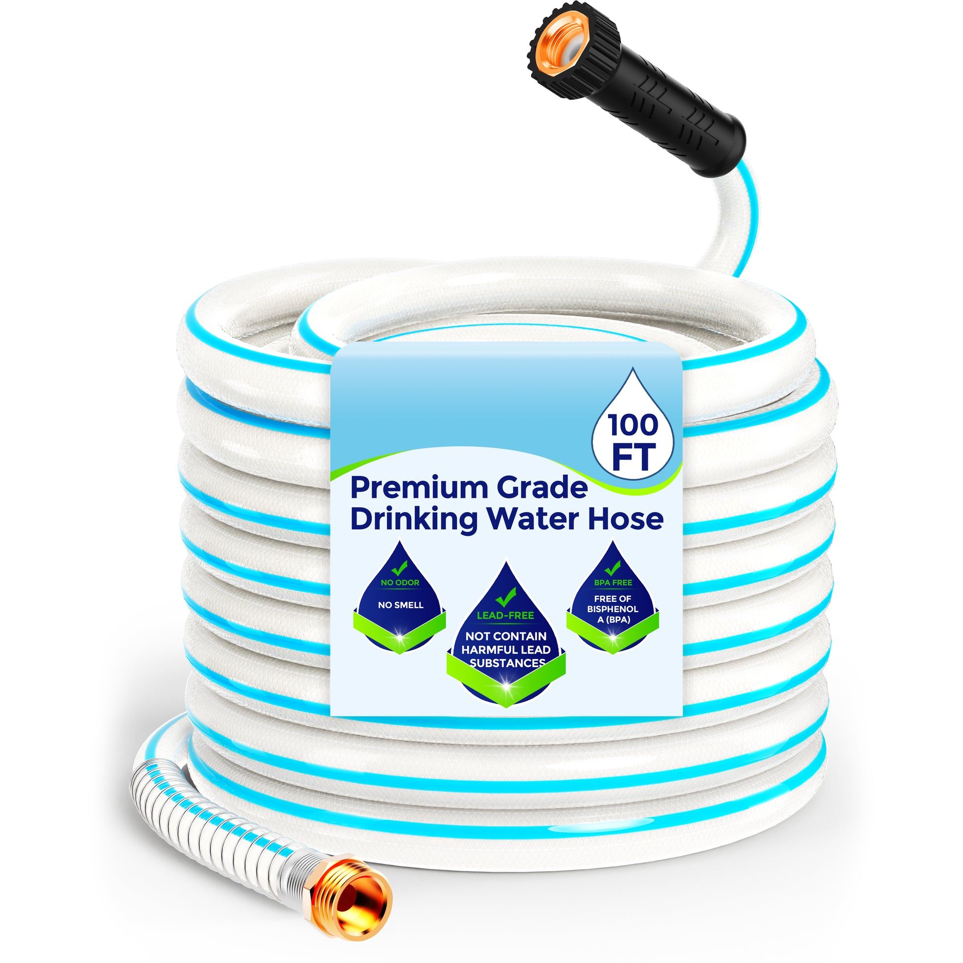 - Lead-Free Drinking Water Hose: This RV water hose is made of environmentally friendly rubber; lead and BPA free; no odor taste; no rubber taste; 150 PSI performance burst