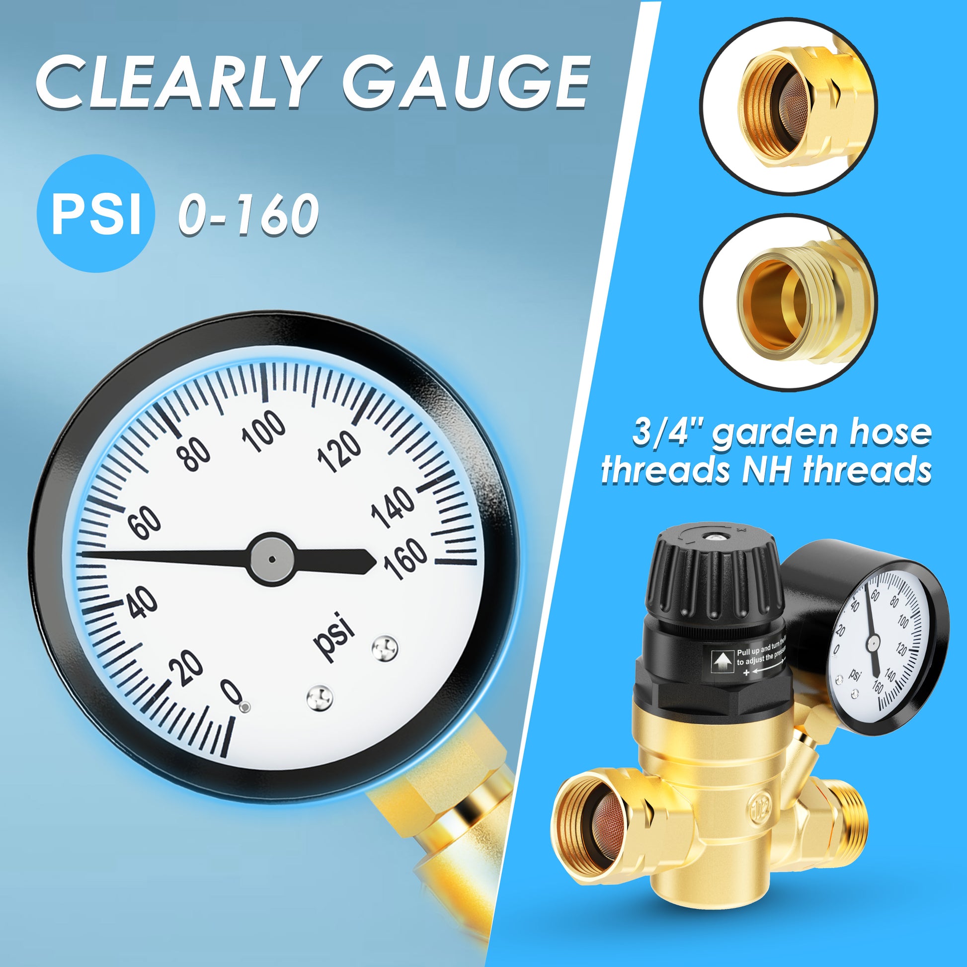 RV Water Pressure Regulator Valve, Brass Lead-Free Adjustable Water Pressure Reducer with Gauge and Inlet Filter for RV Camper and Travel Trailer